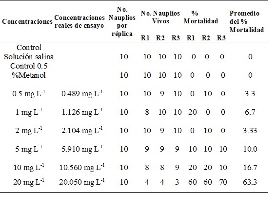 Se realizaron ocho experimentos cada uno de ellos por triplicado. La mortalidad en los controles negativos con agua de mar artificial y solvente 0.5% v/v de metanol en agua de mar artificial fue del 0%, razón por la cual se tomó como control negativo al solvente 0.5% v/v de metanol en agua de mar artificial. El porcentaje de mortalidad en los controles negativos no excedió el 10%. El porcentaje de mortalidad más elevado corresponde a la concentración de 20 mg L-1 de ibuprofeno con el 63.3% de mortalidad de nauplios de Artemia (Tabla 4).