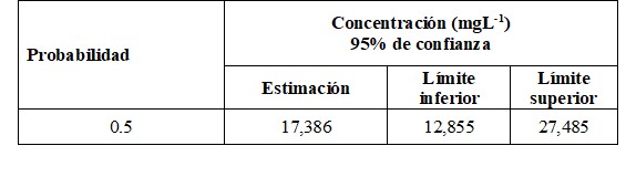 La concentración de ibuprofeno que produce mortalidad sobre el 50% de los nuaplios de Artemia salina en estado II-III en un periodo de exposición de 24 horas CL 50-24h fue 17.386 mg L-1. El valor de la CL50 y sus límites con un 95 % de confianza se muestran en la tabla 5.