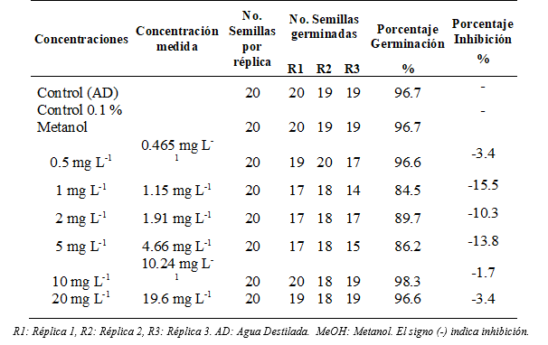 Los efectos fitotóxicos, se determinaron mediante el porcentaje de germinación y la inhibición o estimulación en la elongación de la radícula e hipocótilo.