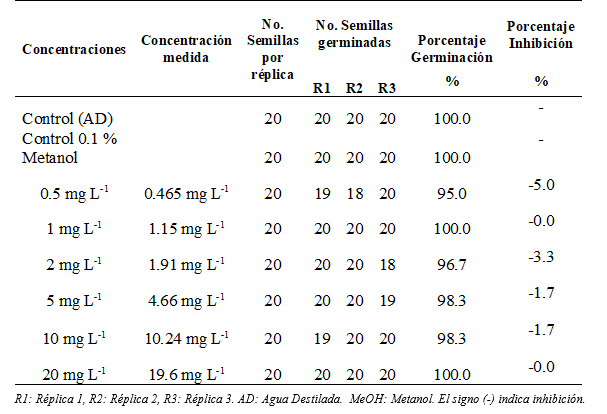 El porcentaje de germinación en los controles con agua destilada y solvente 0.1% v/v de metanol, no presenta ninguna diferencia siendo de 96.7% para el cebollín y 100% para la lechuga. El porcentaje de germinación en los controles negativos fue mayor al 90%.