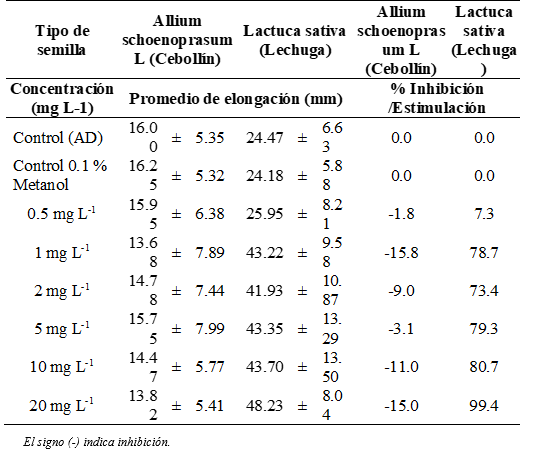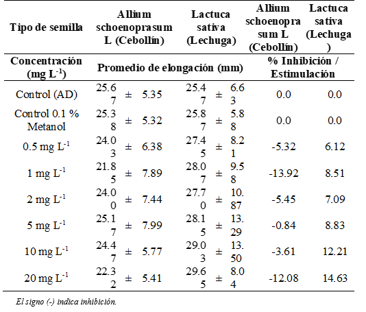En las semillas de cebollín se presentó una disminución en la elongación de la radícula e hipocótilo en comparación con el control negativo, siendo significativamente menor para las concentraciones de 1 y 20 mgL-1 (p < 0.05), de acuerdo al análisis estadístico Kruskal-Wallis. El porcentaje de inhibición más alto para la radícula e hipocótilo se presentó a las concentraciones de 1 y 20 mgL-1 y el porcentaje más bajo de inhibición se observó a las concentraciones de 0.5 mgL-1 y 5 mgL-1. El efecto de inhibición fue menor al 50% en todas las concentraciones.