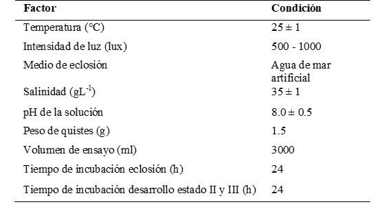En la solución aireada se colocaron aproximadamente 1.5 g de quistes para ser incubados manteniendo una temperatura de 25 ± 1 °C y con iluminación de intensidad de al menos 500 lux. Los quistes fueron mantenidos en suspensión continua mediante aireación con la ayuda de una manguera plástica extendida hasta el fondo del recipiente. Después 24 horas se detuvo la aireación para que los nauplios en movimiento que se concentren en el fondo del recipiente, y mediante pipeteado sean trasferidos a un nuevo envase que contenía 3 litros solución salina. Esta solución con los nauplios, fue nuevamente aireada y mantenida durante exactamente 24 horas a una temperatura de 25 ± 1 ° C y una iluminación de 500 - 1000 lux, en donde se desarrollaron hasta el estado II y III, para luego ser utilizados en las pruebas de toxicidad. Las condiciones para la eclosión de los huevos de Artemia salina se muestran en la tabla 1.