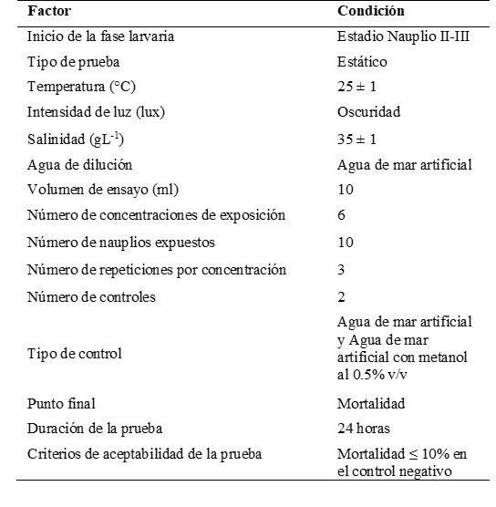 Las condiciones del ensayo de toxicidad se muestran en la tabla 3.