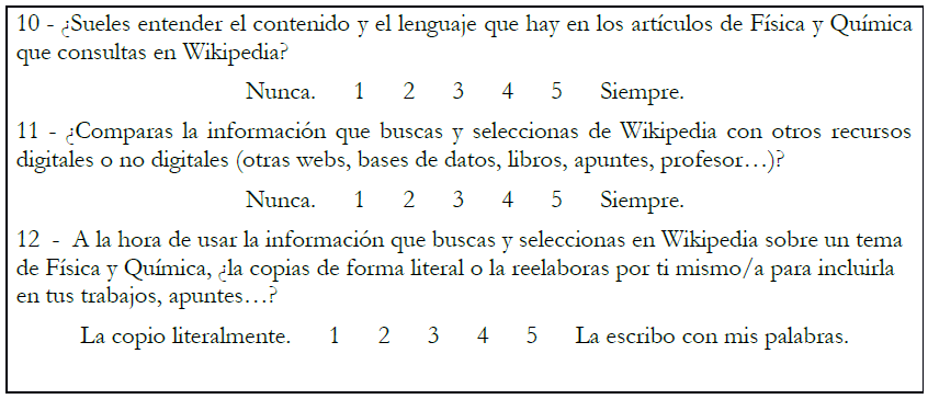 La décima pregunta interroga a los participantes si suelen entender el contenido y lenguaje de los artículos sobre temas de Física o Química que contiene Wikipedia. Se vuelve a usar una escala ordinal de 1 a 5 y un diferencial semántico entre las posiciones “Nunca” y “Siempre” respectivamente. Esta pregunta se justifica en base a los problemas dos y tres, ya que de acuerdo con Badía (2009) y Monereo (2009) la competencia digital implica valorar de forma reflexiva si la información contenida en internet puede resultar válida o no para sus fines educativos. Esta valoración puede comenzar por reflexionar acerca de si entienden su contenido y su forma.