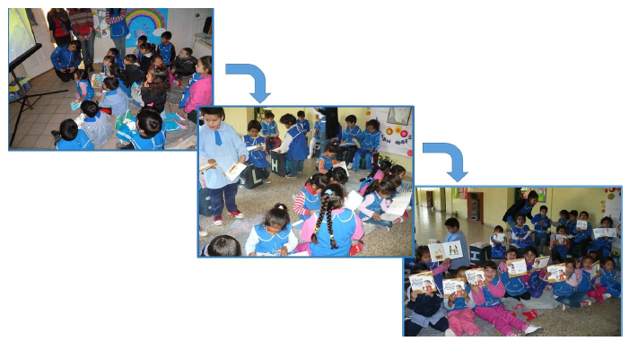 La intervención en el Jardín “Carlos Menem (H)” durante 2013 consistió en la proyección de un video animado (Ramsey Willoquet y Salgado Ramírez, 2008). Posteriormente, se aclararon y explicaron conceptos confusos o dudosos y se respondieron las consultas de docentes y alumnos (Figura 2). A continuación, se repartió a cada alumno un ejemplar del libro de cuentos “El berrinche de la chinche” (material proporcionado por el Ministerio de Salud de la Nación Argentina) y se escuchó el audio de dicho cuento mientras los alumnos seguían las historia en sus libros (Figura 2).