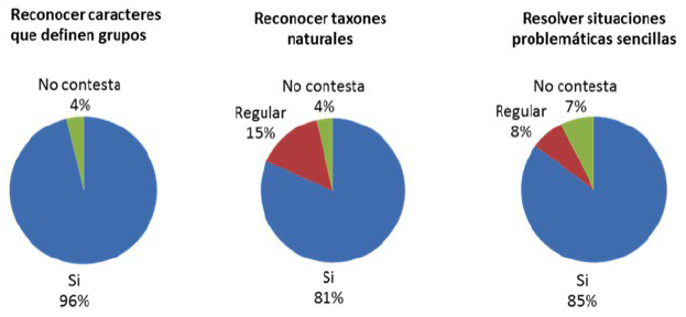 La encuesta realizada en ambas asignaturas (Anexo 2) consistió en dos preguntas. La primera de ellas indagó sobre la percepción que los estudiantes tuvieron acerca de la utilidad de los árboles evolutivos para resolver distintos tipos de situaciones, dependiendo estas últimas del tipo de habilidades puestas en práctica durante el curso. La segunda pregunta se formuló para analizar si los alumnos consideraban que los conocimientos brindados les fueron de utilidad para relacionar la clasificación de las plantas con su historia evolutiva. Se incluyó además una pregunta final en la que se pretendió corroborar si los estudiantes efectivamente habían desarrollado dicha competencia, pidiendo que mencionaran caracteres que permitieran diferenciar taxones de plantas y que se hubieran analizado evolutivamente durante la cursada.