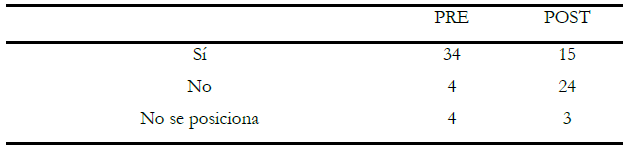 La tabla 1 muestra los resultados obtenidos al preguntar a los estudiantes si creen que los productos homeopáticos son eficaces al inicio de la secuencia y al finalizar la misma.