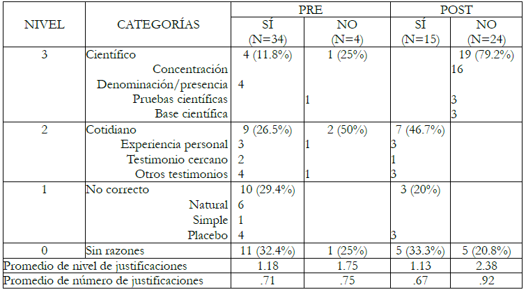 En cuanto a los niveles, sí se observa que hay diferencias entre las justificaciones utilizadas por los que creen en la eficacia de los productos homeopáticos y los que no, y entre las empleadas al inicio de las actividades y al finalizar las mismas. Como se observa, previamente a la secuencia de actividades, las experiencias personales en la vida cotidiana (nivel 2), y los testimonios de otras personas son utilizados para fundamentar sus opiniones por una parte importante del alumnado, tanto para fundamentar la creencia en la eficacia como la postura contraria.