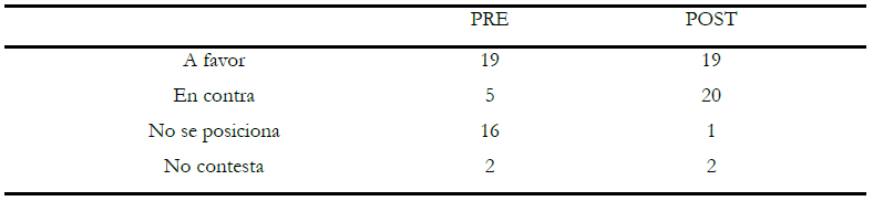 En principio, parece que las personas que estaban a favor de la inclusión de los productos homeopáticos en la categoría de medicamentos mantienen su postura, mientras que ha aumentado el número de personas que están en contra a costa de disminuir el número de personas dudosas. Si se analizan los cambios de postura individuales, la situación se antoja más compleja, ya que se han dado cambios de todo tipo en los posicionamientos. Así, han cambiado de opinión el 47% de los estudiantes que estaban a favor inicialmente, el 89% de los dudosos y el 60% de los que estaban en contra.