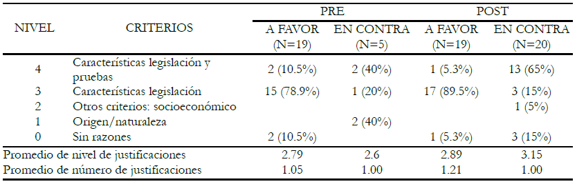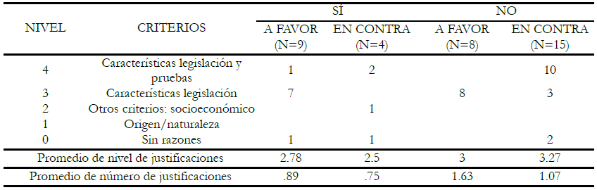 Se ha considerado que las justificaciones eran de distinta calidad en base a varios criterios: opinión basada en razones; adecuación de las razones; independencia intelectual para juzgar quiénes son los expertos (Norris 1995); referencia al ámbito científico. De esta manera, se han establecido 4 niveles.