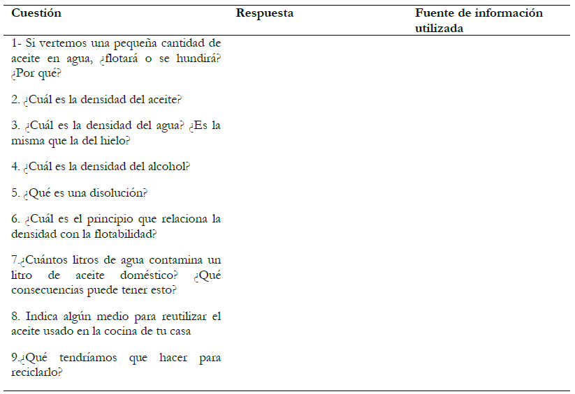 La primera sesión consiste en la presentación de la experiencia de la gota submarina por la profesora y la posterior investigación teórica por parte los y las estudiantes con el propósito de dar respuesta a los comportamientos de la burbuja en función de la concentración de la mezcla agua-alcohol observados. Para ayudar a los y las alumnas a organizar la información se le proporciona a cada pequeño grupo una ficha que se recoge en el Anexo 1 en la que tienen que dar respuesta una serie de cuestiones relacionadas con la experiencia.