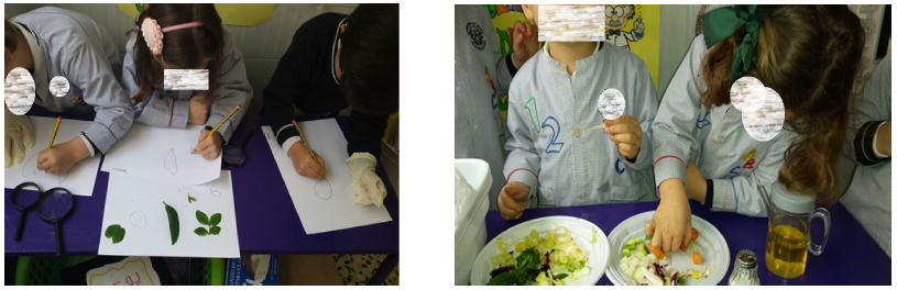 En todas las actividades los niños debían tocar, comparar, oler, mirar con lupa y hacer un dibujo con detalles de lo observado. Davis (2011) afirma que dibujando algo, el niño advierte detalles de ese elemento que pueden pasar desapercibidos cuando sólo lo observa, por lo que este autor considera a dibujar, como un proceso de descubrimiento y potenciación de la observación. También se elaboró un libro incluyendo fotografías y dibujos de los productos y sus observaciones: foto de limón con sus semillas pegadas, fotos de lechuga con sus características, etc.