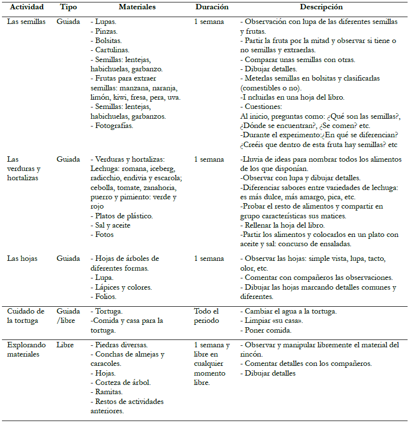 Se programaron actividades (Tabla 1) guiadas y libres (Fernández et al. 2000, 2006, Tavernier, 1987): 3 temáticas semanales, 1 diaria y 1 libre. Se desarrollaron en el tiempo dedicado habitualmente a los rincones (entre 20 y 40 minutos diarios: 2 - 3 h/semana). Los alumnos trabajaban en grupos de 4 ó 5, rotando con el resto rincones ordinarios. De modo informal, también lo utilizaban en su tiempo libre.