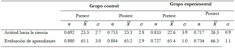 Para comprobar la consistencia de los instrumentos se aplicó el coeficiente alfa de Cronbach. Tras ello, para averiguar el tipo de estadística aplicable (paramétrica o no paramétrica) se efectuó el test de Kolmogorov-Smirnov, que al obtener un p-valor inferior a 0.05 (pretest: D(59)=0.194; p<0.001, posttest, D(59)=0.240; p<0.001), debe rechazarse la hipótesis nula de normalidad, aplicando estadística no paramétrica: para comparar entre grupos distintos (control vs. experimental), el estadístico U de Mann-Whitney; para comparar en el mismo grupo pre-posttest, la prueba de rangos con signo de Wilcoxon (Z), complementado con la media (