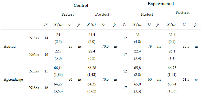 - No hay diferencias estadísticas ni en actitud, ni en aprendizajes entre los niños y las niñas participantes.