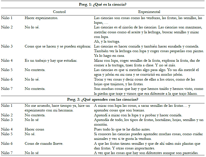 Sin embargo, observando las respuestas de los niños en la entrevista (Tabla 4), las diferencias son notorias, en favor del grupo experimental. Así, puede apreciarse como aparecen grandes diferencias en el nivel de verbalización en todas las respuestas, considerando tanto cantidad, como calidad, con uso de vocabulario específico. Todos los niños del grupo experimental tienen algo que decir, mientras que son pocos los del control que responden. Muy destacable es la manera en que los participantes han interiorizado los aprendizajes de la experiencia, y que se ve reflejado en su traslado a la realidad (pregunta 4).