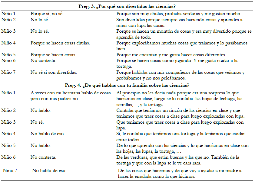 Pero lo que consideramos como más relevante es que estos niños claramente trasladan la ciencia a su lenguaje, a su entorno real, a su familia, es decir, lo hacen significativo. Así: asocian la ciencia con su vida cotidiana, y se ve claro en algunas respuestas a la pregunta 1: « … son cosas como las verduras, las frutas, las semillas, las lupas, …» (niño 1), o «… es que si mezclas algo pasa algo. Yo un día mezclé el agua y jabón en mi casa y se convirtió en mucho jabón» (niña 5). Vemos que este niño identifica la ciencia no sólo con conceptos, sino también con procedimientos («mezclar cosas»). De modo similar lo hace el 6: «Tocar y ver cosas y decir cosas de ellas a los otros». Este niño ha pronunciado 2 de los 3 elementos que Pujol (2003) destaca como fundamentales para aprender ciencias: hacer y hablar (sólo le ha faltado pensar).