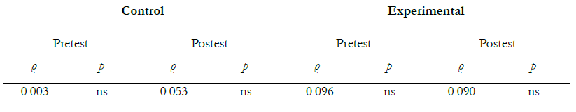 La tabla 5 muestra los resultados del análisis de correlación de Spearman (ρ), y no hay correlación en ninguno de los casos estudiados.