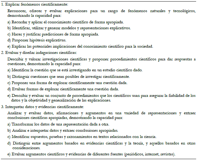 Recientemente PISA ha realizado una actualización de su marco de referencia para las ciencias, que se ha aplicado en la evaluación de 2015. Esto nos ha llevado a analizar la aplicabilidad que este nuevo marco tiene para la enseñanza, en concreto para el diseño de actividades de enseñanza-aprendizaje. En PISA 2015 (OCDE, 2013), las competencias científicas evaluadas son tres: explicar fenómenos científicamente, evaluar y diseñar indagaciones científicas, e interpretar datos y evidencias científicamente. Cada una de estas competencias se pone de manifiesto mediante diversas capacidades (Tabla 1).