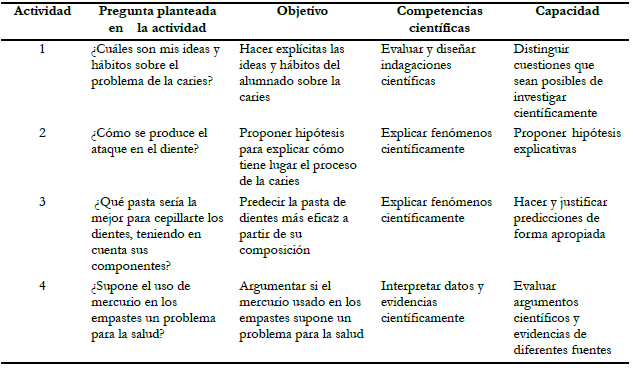 La secuencia gira en torno a la cuestión ¿por qué se pican los dientes? y se plantea en cuatro apartados: su identificación, su prevención, qué debo hacer si la prevención falla y darlo a conocer (Blanco, Franco-Mariscal y España, 2015). La descripción de las actividades se ilustran con ejemplos de respuestas ofrecidas por estudiantes de 4º de E.S.O. del I.E.S. Juan Ramón Jiménez (Málaga, España) con los que se llevó a cabo la validación en la práctica de dicha unidad didáctica. Con idea de ofrecer una visión global de las actividades que se presentan en este trabajo, se recogen en la Tabla 2 sus objetivos y su relación con las competencias científicas que se pretenden desarrollar. Como puede apreciarse, por motivos de espacio, se presentan cuatro actividades y, por ello, sólo se ejemplifican algunas de las capacidades recogidas en las tres competencias científicas de PISA.