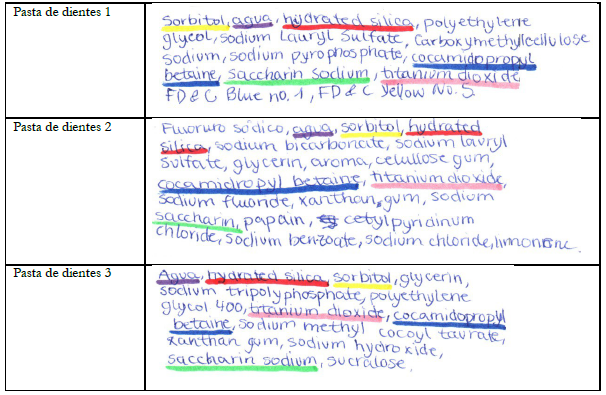 Un aspecto fundamental en la prevención de la caries es conocer algunos de los productos de que disponemos -pastas de dientes y enjuagues bucales-, así como los principales componentes responsables de su efectividad (Crujeiras y Jiménez-Aleixandre, 2012). En esta actividad, cada alumno debe traer al aula un dentífrico para identificar, a través de los datos que aparecen en su etiqueta, cuáles son las sustancias que considera más importantes para hacer más efectiva la pasta. Para ello, los alumnos comparten varios dentífricos y anotan su composición en una tabla. La Tabla 4 muestra un ejemplo donde el alumno sólo es capaz de identificar en tres pastas dentales las sustancias comunes (marcadas del mismo color) porque se le presenta el problema de cómo correlacionar los componentes esenciales de las distintas pastas entre sí, al tener cada dentífrico sustancias aparentemente muy diferentes.
