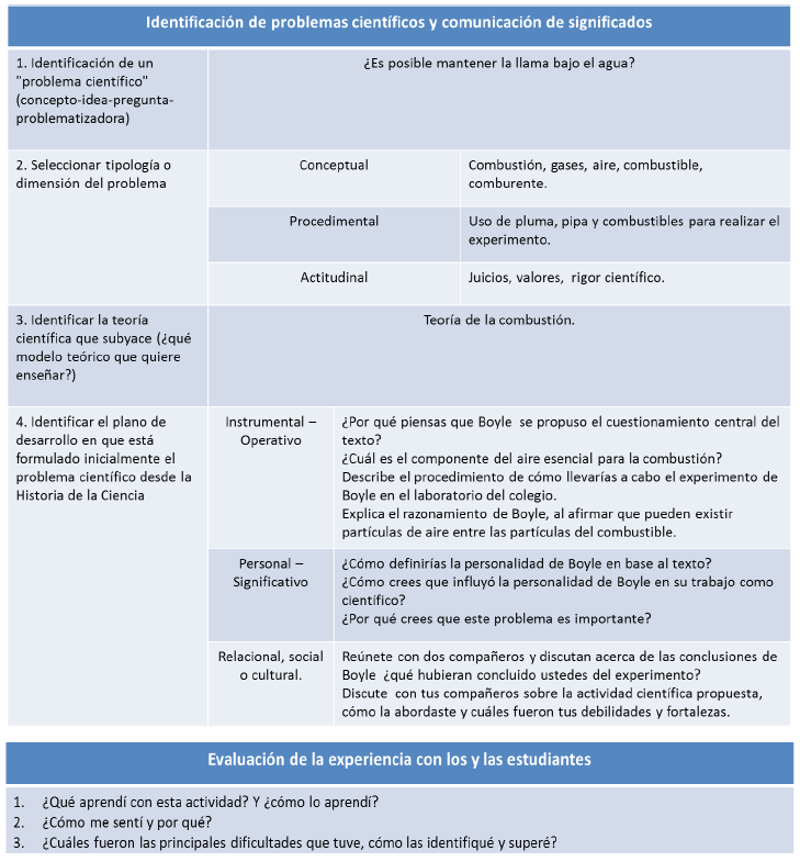 La reflexión e interpretación desde una mirada educativa del análisis del Experimento V de Robert Boyle previamente presentada, permitió diseñar una propuesta de intervención en el aula para estudiantes de 12 – 13 años, pertenecientes al 7º básico del sistema escolar chileno. Es pertinente aclarar que en relación a la identificación del problema científico la pregunta que orientó las sesiones fue ¿Es posible mantener encendida la llama bajo el agua? Con esto se pretende establecer la importancia del estudio de la conservación de la llama bajo el agua como un fenómeno químico de la combustión, y fomentar explícitamente la CPCs correspondiente a la explicación.