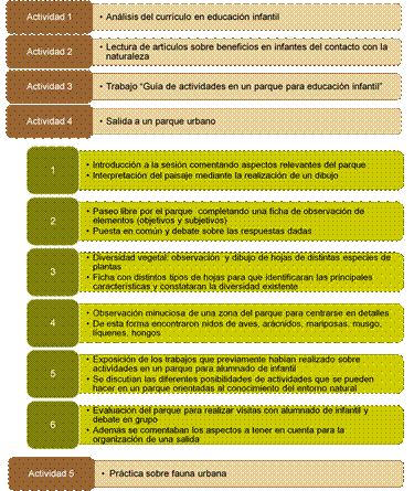 Por otra parte se pidió a los alumnos y alumnas que por grupos de 4-5 realizaran un trabajo en horas no lectivas titulado “Guía de actividades en un parque para Educación Infantil”, en el que tenían que justificar la salida, realizar una descripción de un parque público y diseñar actividades para realizar en ese parque centradas en el conocimiento del entorno natural. Podían tratar temas diversos como paisaje, fenómenos meteorológicos, cambios estacionales, fauna urbana…, además debían fotografiar e identificar algunas especies de árboles o arbustos teniendo que versar alguna de las actividades sobre éstos. De esta forma tenían que seleccionar un parque, visitar dicho parque, estudiar los elementos que lo integran, recopilar información, planificar y programar una o varias salidas con distintas actividades, dependiendo de los objetivos fijados y establecer actividades previas y posteriores a la salida.