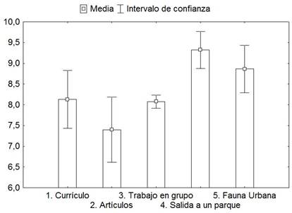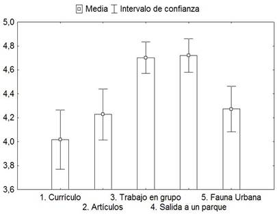 Respecto a la valoración por parte del alumnado de grado del proceso de enseñanza aprendizaje de las distintas actividades realizadas, los resultados de la encuesta muestran diferencias significativas entre esas actividades (Friedman ANOVA Chi Sqr. = 51,61; N = 55; df = 4; p < 0,001), debidas a la mayor calificación de las actividades del trabajo en grupo y salida al parque respecto a la lectura y debate de artículos sobre el tema, la práctica de fauna urbana y el análisis del currículo (Fig. 3). Lo que nos indica la buena aceptación que ha tenido el preparar y realizar una salida a un entorno natural frente a las actividades realizadas en el aula, aunque éstas también poseen una buena valoración superior a 4 puntos sobre 5. La salida al parque constituyó tanto para el profesorado como para el alumnado una actividad destacada y de disfrute de estar al aire libre en contacto con la naturaleza, de salir de la rutina y todos los grupos mostraron una actitud positiva, alegre y entusiasta comentando la posibilidad de realizar más prácticas como esta, lo que tiene especial importancia, ya que estas actitudes positivas hacia actividades realizadas como alumnado favorecerán una mayor valoración de las mismas cuando sean docentes, como han mostrado Costillo Borrego, Borrachero Cortés, Cubero Juánez (2012), lo que constituye uno de los objetivos de este trabajo.