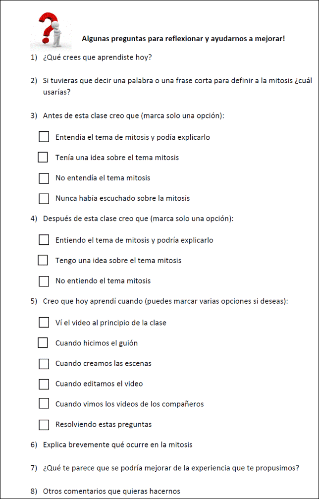 La consigna propuesta fue: «Representen con la técnica de slowmation el proceso de división celular o mitosis, para una célula de una mosca (2n=4), es decir que posee cuatro cromosomas. Para ello deberán construir en primera instancia el guión cinematográfico del video y seleccionar qué estructuras de la célula representarán, por ejemplo membrana plasmática, membrana nuclear, cromosomas, fibras de huso, centrosoma, etc.»