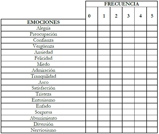 - Tabla con 18 emociones, de las cuales 9 son positivas y las otras 9 restantes, son negativas medidas a través de una escala de puntuación de tipo Likert de 6 puntos.