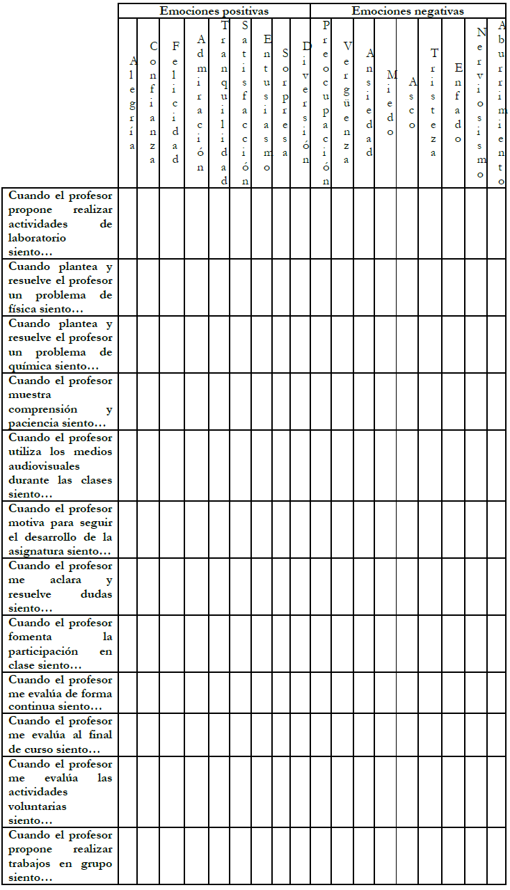 - Conocer las posibles causas de las emociones experimentadas por los alumnos de Educación Secundaria Obligatoria en el aprendizaje de Física y Química, atendiendo a los contenidos y a aspectos relacionados con el profesor.