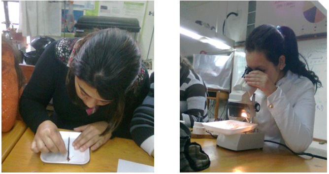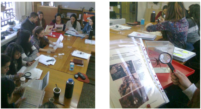 Una vez integrado a la colección, se tiene un material valioso para la enseñanza de la Biología en los jóvenes. Los animales conservados son un recurso para la identificación de grupos taxonómicos y de especies autóctonas y alóctonas, en actividades de observación orientadas por claves dicotómicas y fichas técnicas. La determinación o identificación de especímenes requiere de la observación de caracteres que permiten ubicarlo en un determinado taxón. Los instrumentos más usados para la identificación son la lupa y elementos para manipular la muestra en la lupa (caja de Petri, agujas de disección y pinza de punta fina). Las claves y fichas técnicas con fotografías y dibujos de los organismos, son importantes recursos para acompañar y orientar la observación del material (Custodio et al. 2015) (figura 12).