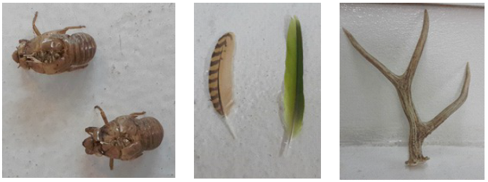 La salida de campo puede ser también proveedora de material natural; nos referimos a la colecta de organismos. Al respecto queremos señalar el valor de recoger aquellas partes desechadas o abandonadas por ellos. Tal es el caso de las exuvias, ootecas y crisálidas vacías de artrópodos, nidos viejos de aves, camisa de ofidios, plumas desprendidas, astas volteadas, entre otros (figura 3). Son estos valiosos recursos didácticos que se pueden integrar a la colección biológica de las Escuela; no implican daño alguno ni a los organismos ni a los ecosistemas.