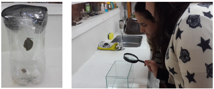 La salida de campo también puede aportar material natural vivo, para su posterior uso en el aula. En determinados casos y temas, la observación de organismos vivos en el laboratorio puede ser una muy buena actividad para la enseñanza y aprendizaje de la Biología. Al igual que las disecciones (sobre las cuales hablaremos más adelante), es necesario tener presente algunas consideraciones didácticas y éticas que permitan un buen aprovechamiento de la observación del material natural. Teniendo como objetivo la construcción colectiva de conocimiento, programar una guía escrita o un interrogatorio didáctico oral sobre lo que se observa, facilitará la tarea. También es importante incluir en todo momento las concepciones previas de los estudiantes, las que median entre lo que observa y las explicaciones que da de lo que observa. En lo que refiere al aspecto ético, es importante el buen traslado y manipulación del animal, evitándole así el sufrimiento. Para especies que no son invasoras y perjudiciales en el ecosistema, es importante considerar el reintegro del ejemplar a su hábitat luego de finalizado la actividad en el aula (figura 4).