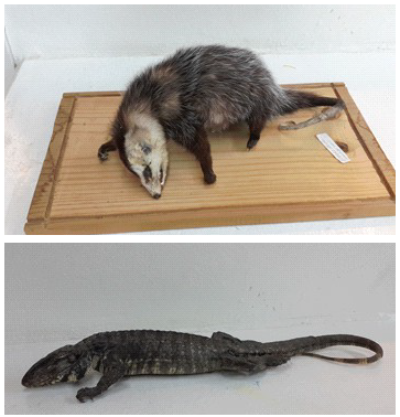 Integran también el grupo 1, las pieles de mamíferos, aves y reptiles que pueden ser montadas en taxidermia. Se trata de la técnica de disecar animales para conservarlos con apariencia de vivos y facilitar así su exposición, estudio y conservación. Un origen ético para la obtención de material a taxidermizar son los cadáveres en las carreteras (figura 6). Aún con las distintas medidas adoptadas en los países para disminuir las muertes de animales en las carreteras, son muchos los que todos los años perecen en ellas. En España se calcula en varios millones por año (Palacios 2008); en Uruguay no hay una estimación cuantitativa de los accidentes entre automóviles y animales salvajes en las carreteras. Las rutas nacionales del Uruguay atraviesan el principal ecosistema del territorio, la pradera, siendo frecuente ver en el asfalto distintos ejemplares de mamíferos, aves y reptiles habitantes de la pradera, que intentaron cruzarlo sin éxito. La colecta de estos cadáveres es una fuente ética para la preparación de material taxidérmico de las colecciones de los centros educativos (figura 7).
