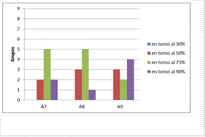 Aunque en la mayoría de los grupos se realizan las tres actividades completando al menos el 75% de las tareas que deben realizar (gráfico 2), son pocos los estudiantes que completan el análisis comparativo entre análogo y tópico, tal como se pedía en las hojas de trabajo del alumno, sobre todo en las analogías del estado líquido y gaseoso (A8), lo que coincide con el cambio en la dinámica de trabajo de los alumnos antes señalado. Aun así, al menos en cuatro grupos, parece que el trabajo realizado es suficiente para que los alumnos completen todas las tareas (en torno al 90 %) en la analogía del cambio de estado (A9), la más compleja. De hecho, los profesores destacaron que hubo bastantes alumnos que no utilizaron el símil propuesto e inventaron su propia analogía. También insistieron en la falta de hábito de los estudiantes, a los planteamientos metodológicos de la propuesta, como causa de las pérdidas de tiempo que explica no hayan realizado todas las tareas según lo previsto en las hojas de trabajo.
