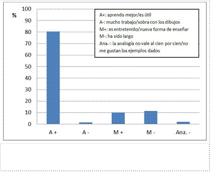 Por su parte, la mayoría de los estudiantes ha valorado positivamente las analogías más por su contribución al aprendizaje que por aspectos metodológicos, pues ha destacado que les ha ayudado a comprender y a utilizar el modelo cinético particular de la materia en las explicaciones de los fenómenos estudiados.