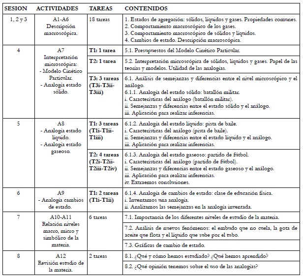La secuencia del contenido se inicia con el estudio de los estados de agregación a nivel macroscópico, abordando las propiedades comunes a cada estado y las semejanzas y diferencias en su comportamiento por efecto de la presión y la temperatura, con un soporte empírico sobre los fenómenos de difusión, compresión y dilatación, necesario para comprender el comportamiento mecánico de los gases y sus propiedades comunes (actividades A1-A3). A continuación, se estudian los cambios de estado también a nivel macroscópico con su correspondiente soporte empírico (actividades A4-A6). Tras el estudio macroscópico, la propuesta de enseñanza da explicaciones al comportamiento fenomenológico de la materia postulando su naturaleza discontinua desde una versión escolar de la teoría cinética, llamada Modelo Cinético Particular, utilizando las analogías para discutir y comprender dicho nivel microscópico (actividades A7-A9). La propuesta concluye con las necesarias relaciones entre los niveles macro, micro y simbólico de la materia (actividades A10-A12). El número de sesiones, actividades, tareas y contenidos de la propuesta se muestra en la tabla 1, donde se describen de modo más extenso los aspectos relacionados con el uso de las analogías. Las actividades aparecen desglosadas en tareas que, para las sesiones 4, 5 y 6, se codifican (T1, T2, T3i, T3ii, ..) con la intención de identificar el objeto de estudio de este trabajo, es decir, aquello que se investiga.