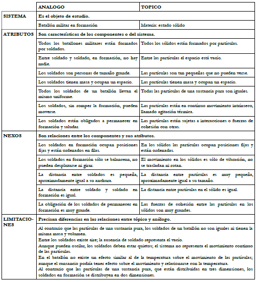 A modo de ilustración, la tabla 2 recoge el resultado del análisis para la analogía del estado sólido con el modelo cinético particular, como tópico, y el batallón militar, como análogo.