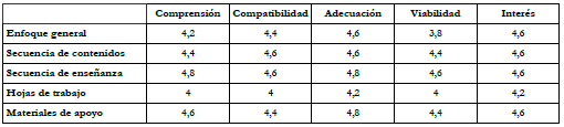 Las respuestas al segundo interrogante, ¿Qué valoración te merece la propuesta de enseñanza y su desarrollo?, se recogen en la tabla 3 donde mostramos los valores medios que resultan del posicionamiento de los cinco profesores, dentro de la escala Likert, a los diferentes aspectos contemplados: el enfoque general, la secuencia de contenidos, la secuencia de enseñanza, las hojas de trabajo de los alumnos y los materiales de apoyo al profesor.