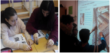 Los alumnos realizan una interpretación inicial de los casos, para lo que se les proporcionan coches de juguete. Al discutir sus hipótesis sobre el posible desarrollo de los accidentes, los alumnos establecen espontáneamente la necesidad de un punto de referencia para el movimiento: ‹‹Esto es la farola›› ‹‹Aquí está el cruce›› (figura 2), algo que se ha utilizado para discutir con ellos este concepto.