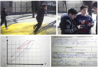 En esta etapa los alumnos identifican las relaciones entre magnitudes (velocidad, aceleración, fuerza) y aprenden a reproducir, identificar y representar distintos tipos de movimientos (MRU, MRUA) con la ayuda de gráficos y vectores. Por un lado, los alumnos cronometran un desplazamiento de 20 metros en distintas circunstancias (caminando, corriendo, acelerando...) y representan y estudian el movimiento, identificando la pendiente como velocidad y trabajando las unidades de medida de la velocidad. Continúan además con el trabajo con modelos Frayer para definir cada nuevo concepto (Frayer et al. 1969) (figura 3).