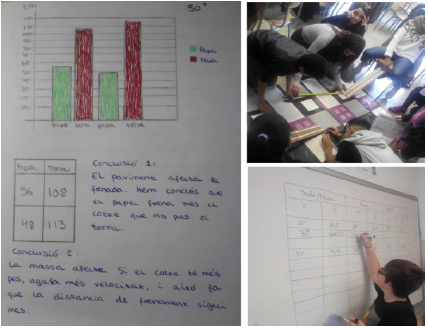 Por otro lado, los alumnos realizan prácticas con el diseño experimental para desarrollar las relaciones cualitativas entre variables. Éste se compone de rampas de inclinación ajustable para dar distintas velocidades a coches de juguete, distintas superficies (papel, hule, cerámica) y lastres para cambiar la fricción y masa de los coches. Organizados en equipos, los alumnos logran establecer distintas relaciones (qué superficies tienen más fricción, qué efecto tiene la masa en el tiempo de frenada...) que comparten y presentan al resto del grupo (figura 4). Como síntesis, el profesor acompaña la formalización de los descubrimientos de los alumnos como las 3 leyes de la dinámica newtoniana (inercia, principio fundamental y acción-reacción) y el concepto de fricción. En esta etapa la mayor parte del alumnado ha sido capaz de diseñar experimentos con sentido, representar los datos y elaborar conclusiones a partir de ellos. Sólo dos equipos no han llegado a completar esta etapa por problemas de actitud y dispersión. En la conversación posterior, han emergido de forma repetida confusiones entre masa y peso, y aceleración y velocidad.