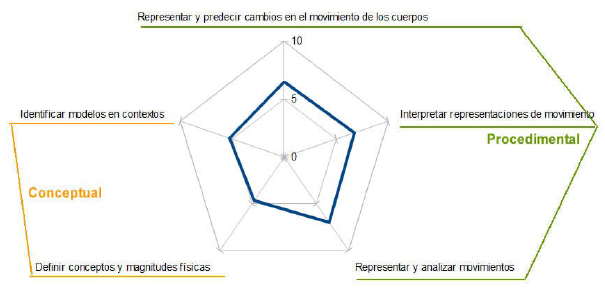 El examen realizado por los alumnos incluye distintas preguntas destinadas a evaluar aspectos conceptuales y procedimentales de la competencia científica. Las cinco preguntas evalúan distintos aspectos de competencia científica y (figura 7) observamos que las preguntas relativas a la dimensión procedimental obtienen de media mejores calificaciones que aquéllas relativas a la dimensión conceptual. De forma general, los alumnos hacen un buen uso de vectores y de los términos ‹‹dirección» y ‹‹sentido», y desarrollan aproximaciones rudimentarias de la conservación de la cantidad de movimiento al argumentar sobre trayectorias de choques entre objetos ‹‹Como el 1 tiene más velocidad, al nivelar la masa/velocidad el 2 aumenta la velocidad y el uno la disminuye››, ‹‹Como más o menos pesan lo mismo al chocarse se igualaran las velocidades››. En lo referente a las leyes de la dinámica los alumnos presentan en particular dificultades con el principio de acción-reacción. En cambio, desarrollan bien el principio fundamental de la dinámica, si bien con algunas confusiones en algunos casos identificando inercia con ímpetu.