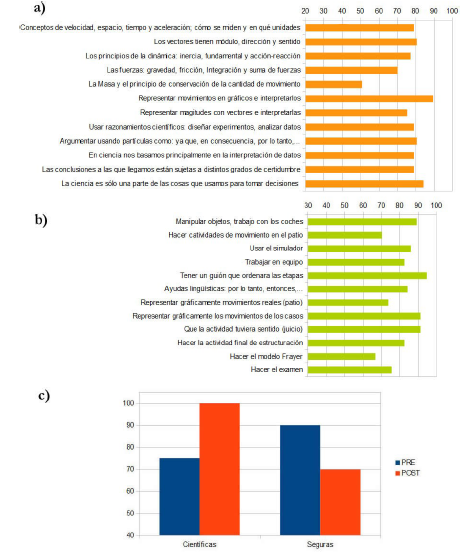 La encuesta al alumnado (figura 8) muestra que los alumnos consideran que la actividad ha desarrollado aspectos conceptuales, procedimentales y epistémicos, en particular la representación e interpretación de gráficos y el carácter socio-científico de las decisiones. En cambio el trabajo con fuerzas y la conservación del movimiento son apercibidos como elementos menos aprendidos por el alumnado. En conversaciones con el alumnado destacan que han aprendido a no fiarse de las apariencias y esperar a analizar las evidencias antes de tomar una decisión.