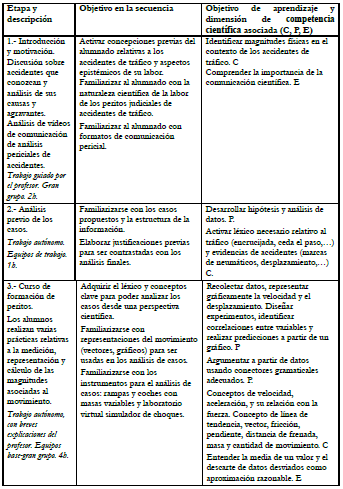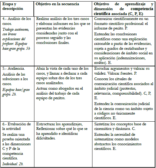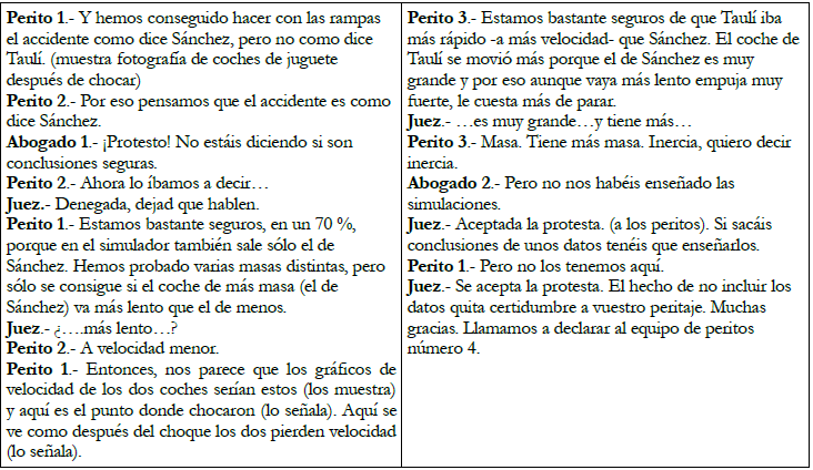 En estos juicios, a menudo, participa la figura del perito, un experto que analiza el accidente desde un punto de vista científico, partiendo de evidencias (estado y posición de los vehículos, testimonios, marcas o residuos en la calzada) que contrasta, determinando el grado de certidumbre de sus conclusiones para que sean evaluadas por el juez. Es un contexto muy prometedor para el trabajo competencial de la cinemática y la dinámica desde una perspectiva conceptual (magnitudes, vectores, representación y estudio del movimiento y sus causas), procedimental (trabajo investigador a partir de medidas indirectas y experimentación) y epistémica (establecer niveles de certidumbre de conclusiones y métodos de validación del conocimiento).