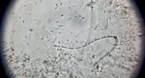 Una estimación razonable de la resolución puede hacerse examinando bacterias. La descomposición de hojas de lechuga mantenidas en agua durante varios días conduce a una gran proliferación bacteriana. Del vídeo grabado a través del microscopio (Del Mazo 2018), que muestra en vivo la población de bacilos de una gota de agua, se ha seleccionado una imagen (figura 9). Sabiendo que los bacilos tienen diámetros próximos a 1 µm, puede concluirse que el microscopio resuelve objetos de este tamaño, algo superior al calculado teóricamente.