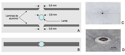 Para que una diminuta esfera de vidrio, con los elevados aumentos que proporciona, resulte útil, el microscopio tiene que disponer de un sistema mecánico suficientemente preciso. Aquí se ha elegido un diseño que funciona de forma muy satisfactoria, aunque pueden idearse otros. Se cortan dos láminas rectangulares de aluminio de 2,0 cm por 1,2 cm y 0,15 mm de espesor cada una. Ambas láminas se perforan con una broca de 0,6 mm de diámetro y se eliminan las rebabas con lija fina de agua del número 360, por ejemplo (figura 5, A). En la zona perforada de cada lámina se crea una pequeña depresión, de modo que entre ambas quede aprisionada la lente (figura 5, B). Por último, las dos láminas se inmovilizan (figura 5, C) con un poco de adhesivo epoxi de dos componentes. Es muy importante que la lente sobresalga de la superficie del aluminio por el lado dirigido hacia la preparación microscópica que va a observarse (figura 5, D).