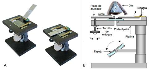 El bloque de láminas que alberga la lente ha de fijarse a un soporte suficientemente sólido. En este caso, se ha pegado sobre la abertura central realizada en una placa rígida de aluminio que puede girar sobre una bisagra (figura 6, A). El portaobjetos con la muestra se deposita sobre una platina, que puede ser de madera. La lente tiene que estar a una distancia de la muestra inferior a 0,2 mm, por lo que es necesario un sistema de enfoque bastante preciso; un tornillo que gira en el interior de una tuerca pegada a la platina cumple satisfactoriamente este requisito. La mejor calidad de la imagen se consigue iluminando la muestra con una fuente extensa como es el cielo (evitando la luz directa del Sol) cuya luz se dirige por medio de un pequeño espejo giratorio, que puede ser plano o, mejor, cóncavo. La observación se realiza aproximando mucho el ojo a la lente (figura 6, B).