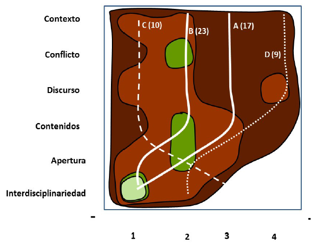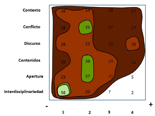 Se colectaron 87 diseños de proyectos durante las distintas sesiones. Los distintos proyectos presentaron una distribución desigual en las distintas componentes (Fig. 1). Sólo 9 de los 87 proyectos incorporaron 3 o más materias, y 58 (un 75%) incorporaron sólo una materia (algo esperable, pues dos de las sesiones se dedicaron al desarrollo de proyectos de área). Los proyectos se concentran en una zona con un despliegue moderado (nivel 2) del conflicto, los contenidos y el grado de apertura. Principalmente se crearon proyectos en los que los contenidos están en la periferia del conflicto, se desarrollan de manera parcial e informal y los alumnos participan en la evaluación, pero no en decisiones sobre los productos.